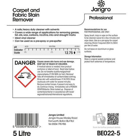 Jangro Carpet & Fabric Stain Remover 5L - BE022-5 | Heavy-Duty Multi-Surface Cleaner
