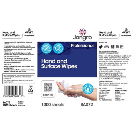 £6.20Unit price /UnavailableIn stock (66 units)Jangro Hand & Surface Wipes 1000pk – BA072 | Bulk Antibacterial Wipes Tub