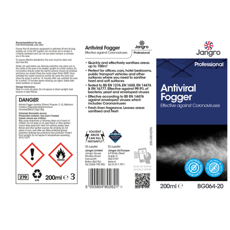£6.00Unit price /UnavailableIn stock (12 units)Jangro Antiviral Fogger 200ml - BG064-20 | Kills 99.9% of Germs & Viruses